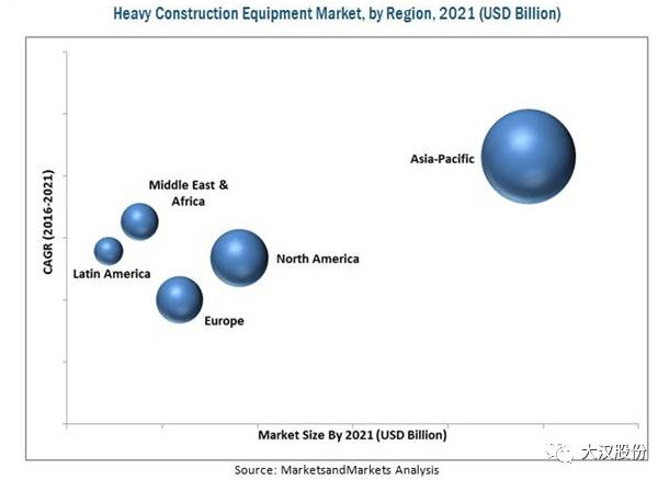 據(jù)MarketsandMarkets預(yù)測,重型建筑設(shè)備市場規(guī)模將從2016年的1291.1億美元增長到2021年的1806.6億美元,估計復(fù)合年增長率為7.0%。預(yù)計重型建筑設(shè)備市場將由于城市化程度提高、基礎(chǔ)設(shè)施和工業(yè)部門的大規(guī)模投資以及新興經(jīng)濟體的建設(shè)活動增加而高速增長。