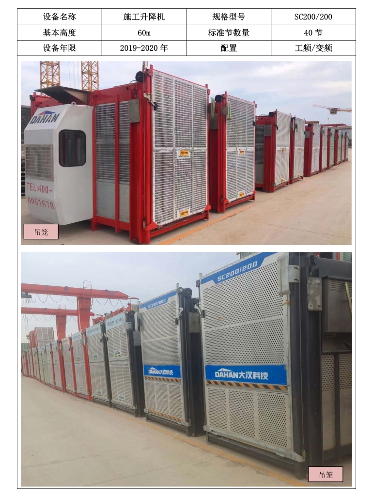 大漢科技股份有限公司發(fā)布二手施工升降機(jī)銷售咨詢信息。拍攝圖片所展示的設(shè)備為二手施工升降機(jī)產(chǎn)品,出廠日期為2019-2020年之間,含變頻、非變頻兩種型號,所有銷售設(shè)備均手續(xù)齊全、檢修保養(yǎng)完畢,以上圖片皆為實(shí)景實(shí)拍,隨時(shí)歡迎有需要的客戶咨詢考察!二手設(shè)備再利用,為您創(chuàng)造新價(jià)值!